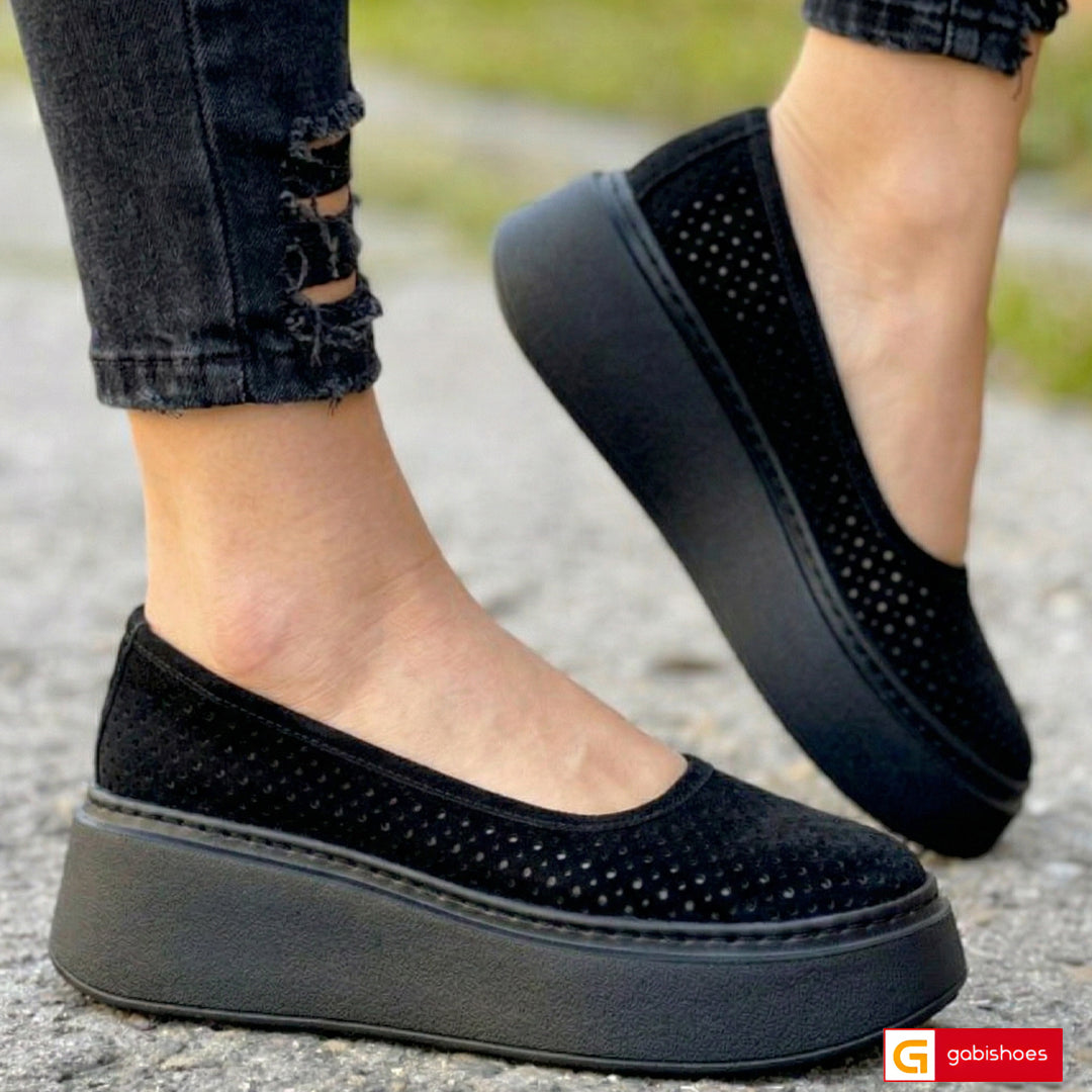 Caracteristici: balerini dama piele naturala intoarsa neagra cu imprimeu gaurele