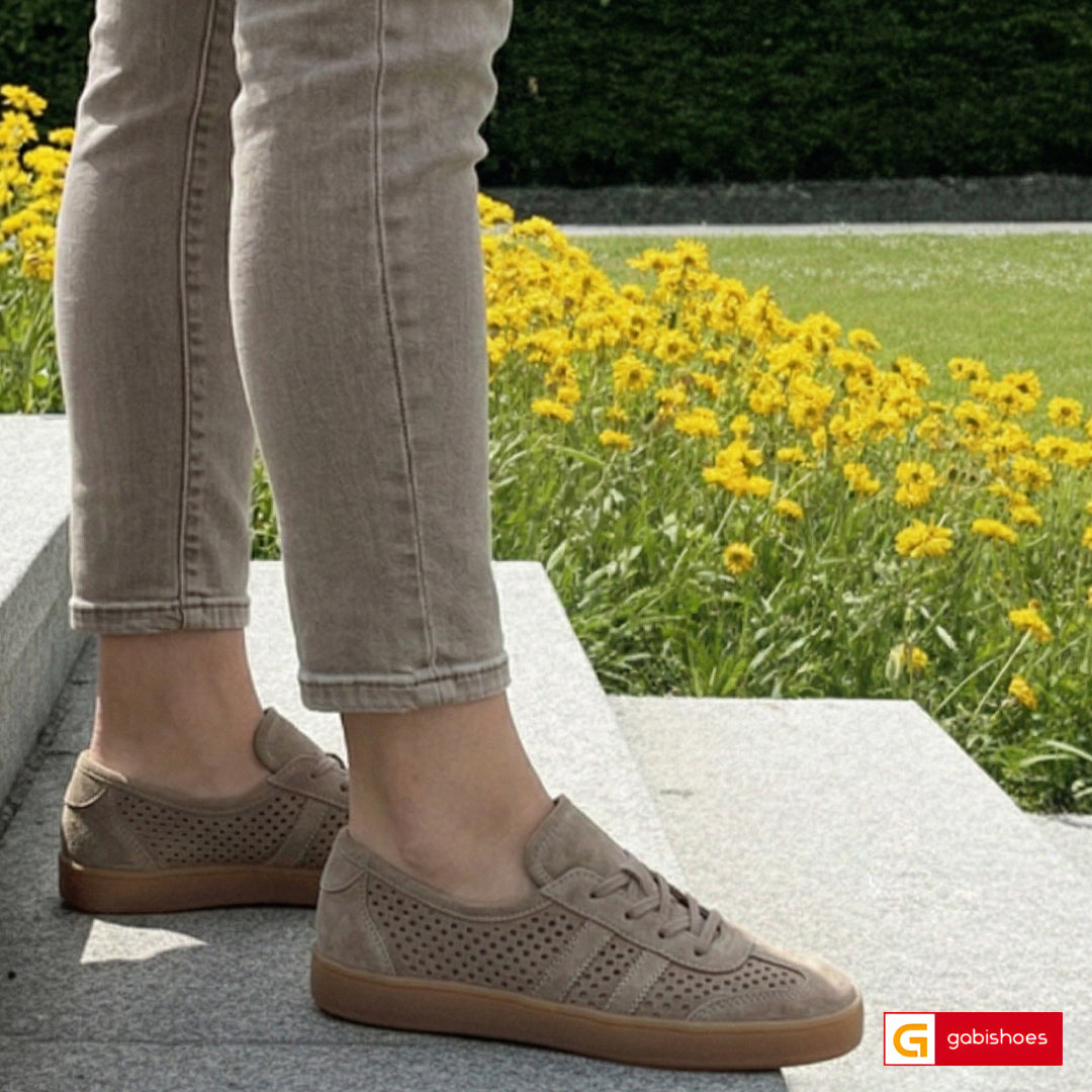 - Balerini piele naturala intoarsa taupe cu model si gaurele mici