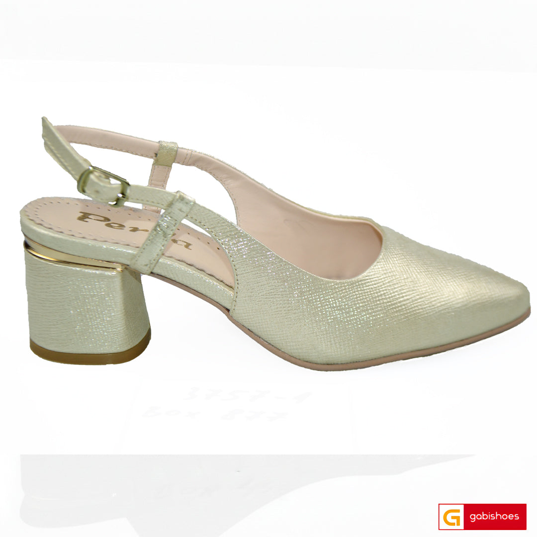 - Pantofi piele naturala bej cu imprimeu auriu , ornament auriu la toc