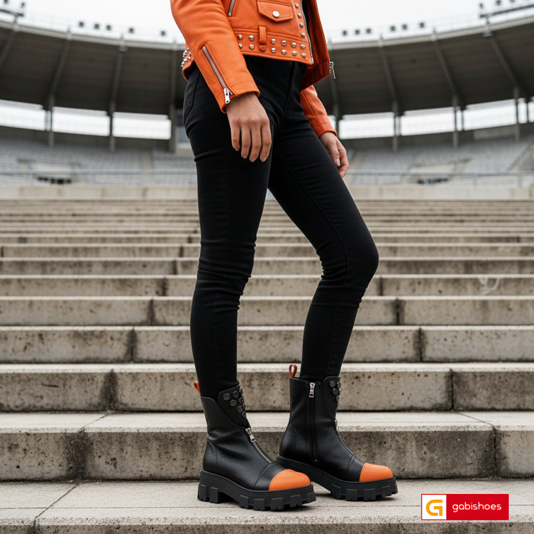 - Ghete piele naturala negru cu portocaliu ,ornamente argintii