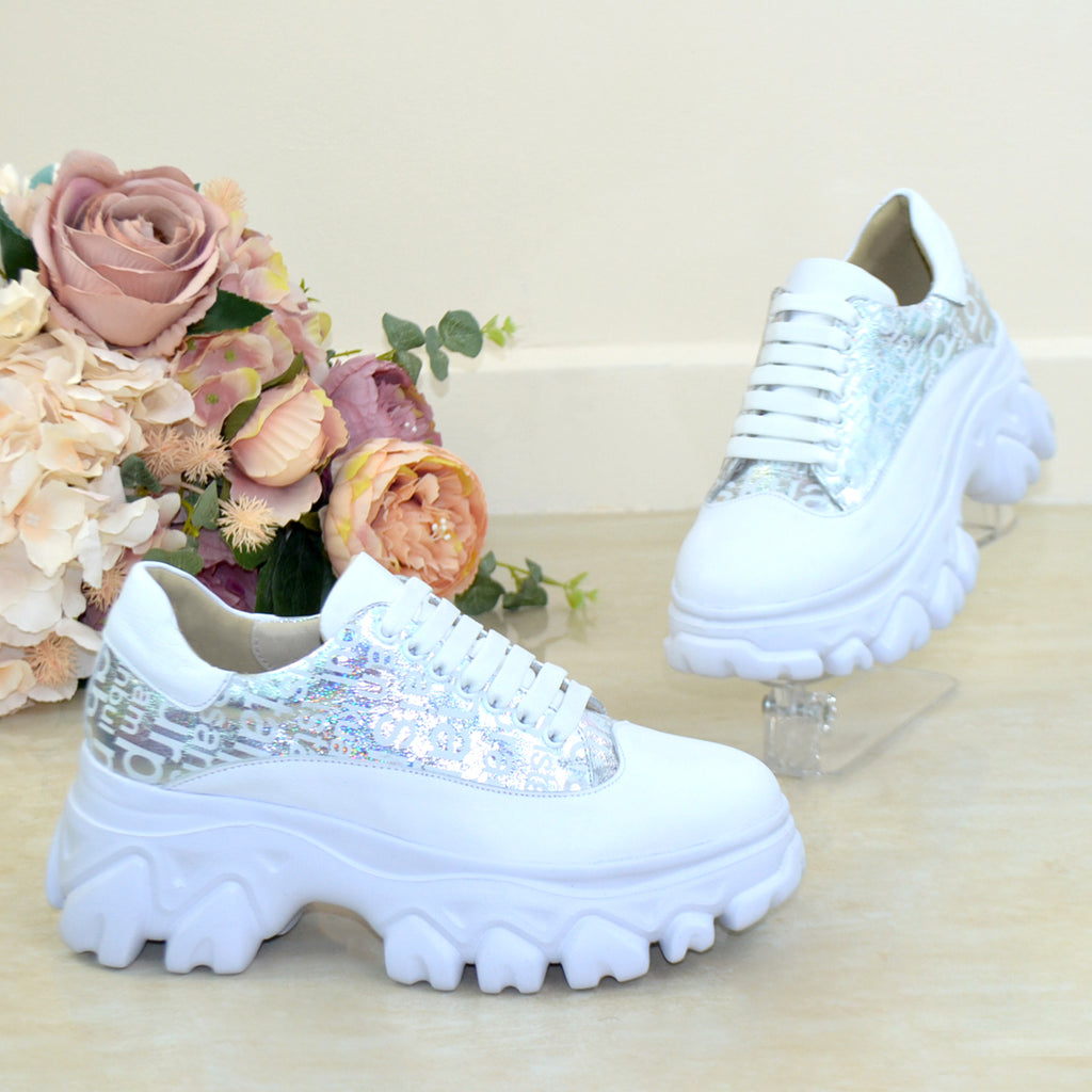 Pantofi Casual Piele Naturala Nona Alb cu Argintiu