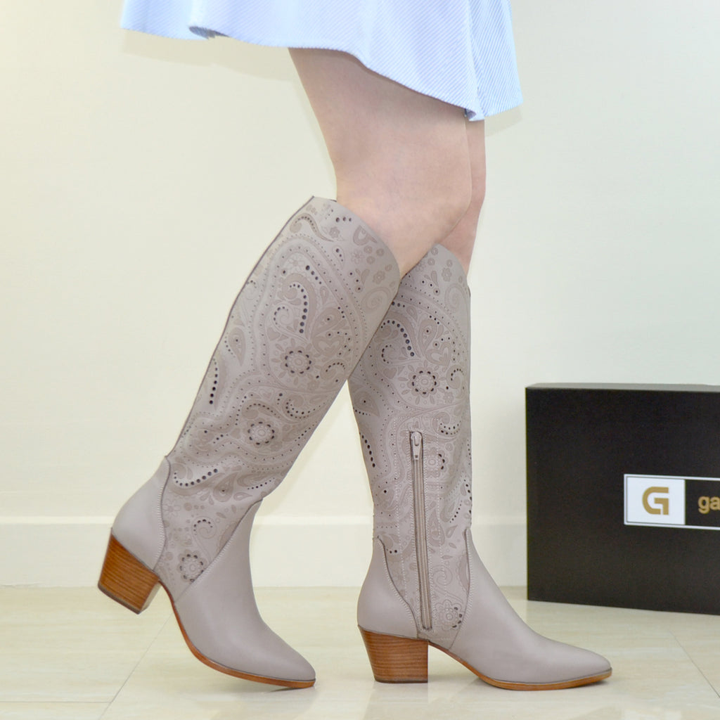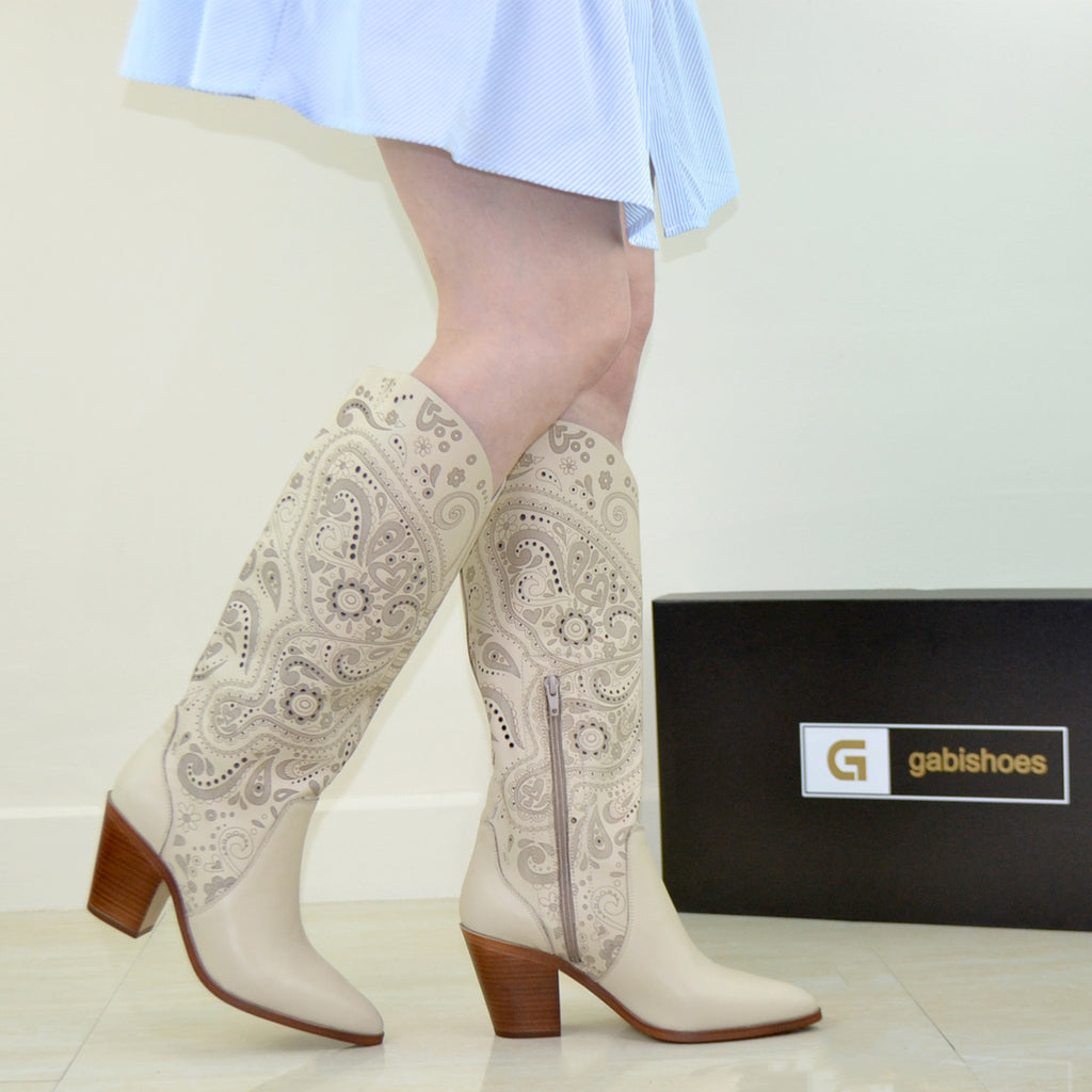 Cizme Dama Bej Piele Naturala Perforate cu Fermoar Camelia 1506-10