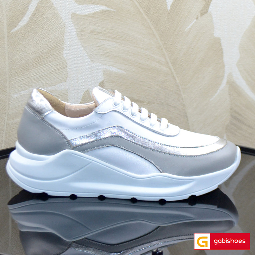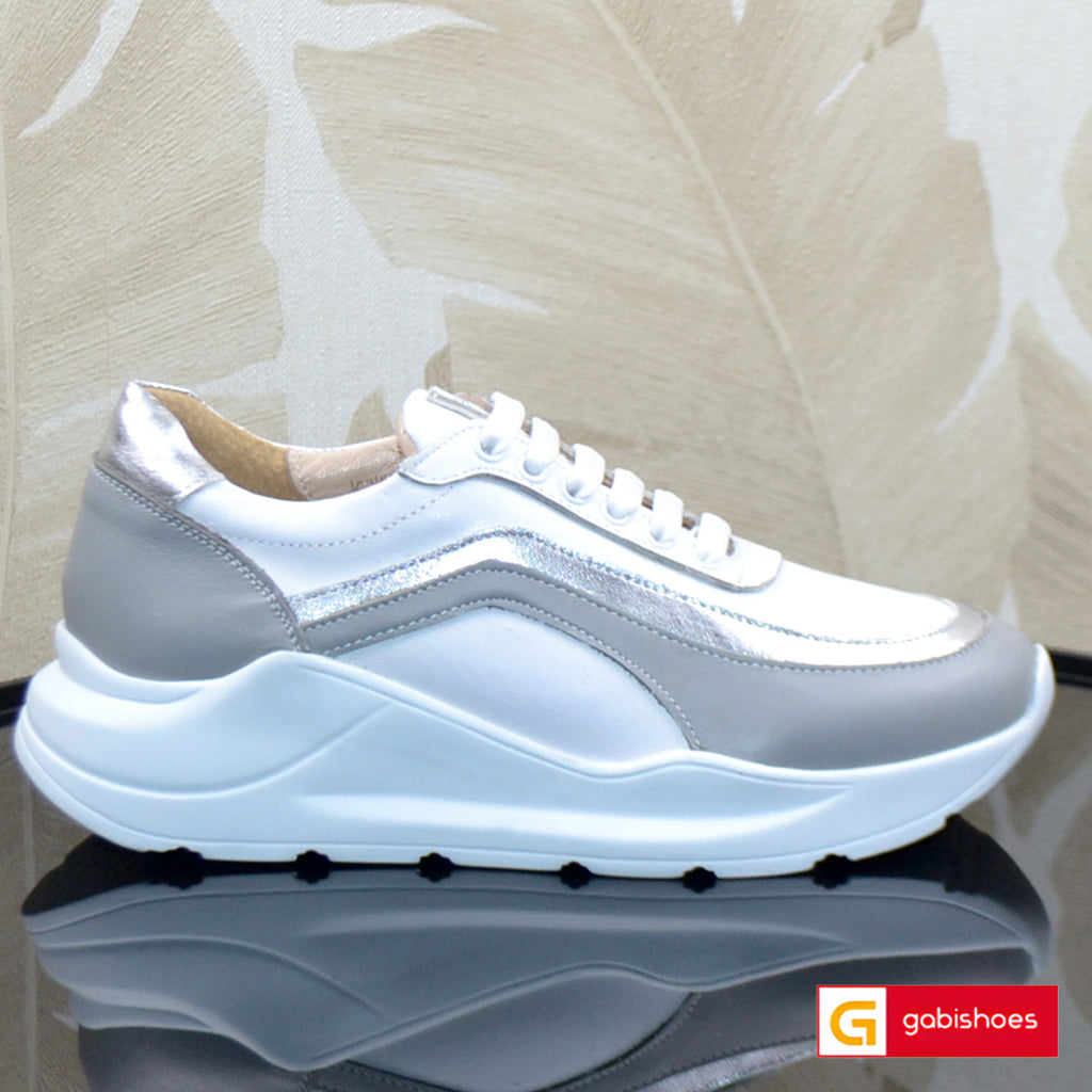 Pantofi Sport Piele Naturala Alba cu Argintiu Si Gri Lorena 3066-1