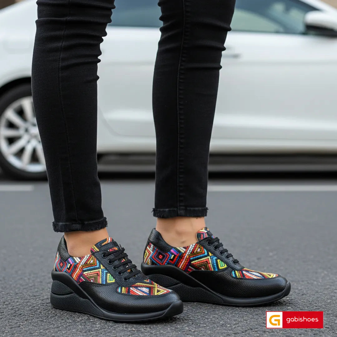 - Pantofi piele naturala neagru box si piele multicolora, pantofi cu siret